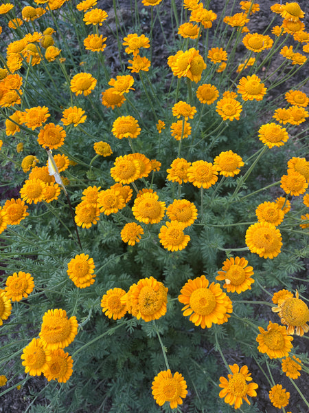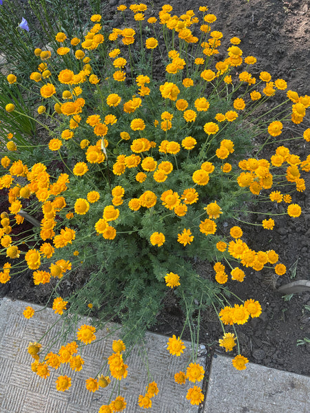 Saint John's Chamomile is a 2' tall perennial with fragant fern like foliage and many orange-yellow daisy flowers for much of the summer and fall. Native to the mountains of Bulgaria and can apparently be used as a dye plant. NOTE: this is not the regular Chamomile used for tea, that is called German Chamomile (Matricaria recutita), but the flower petals can be added into salads to provide some colour.
