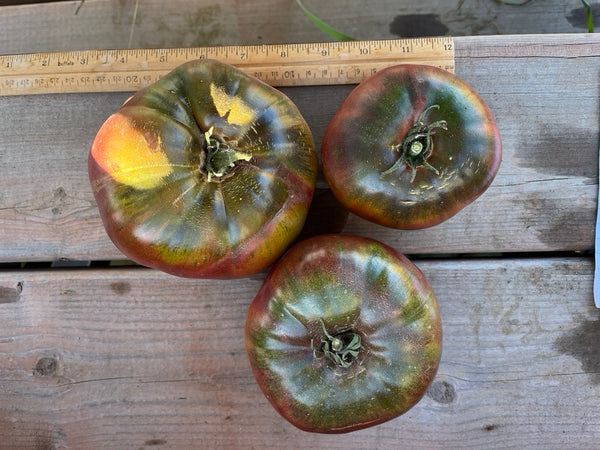 Indeterminate plants producing a heavy yield of delicious beefsteak tomatoes with a dark colour and slightly green shoulders. One of the best tasting tomatoes for us in our 2025 gardens!