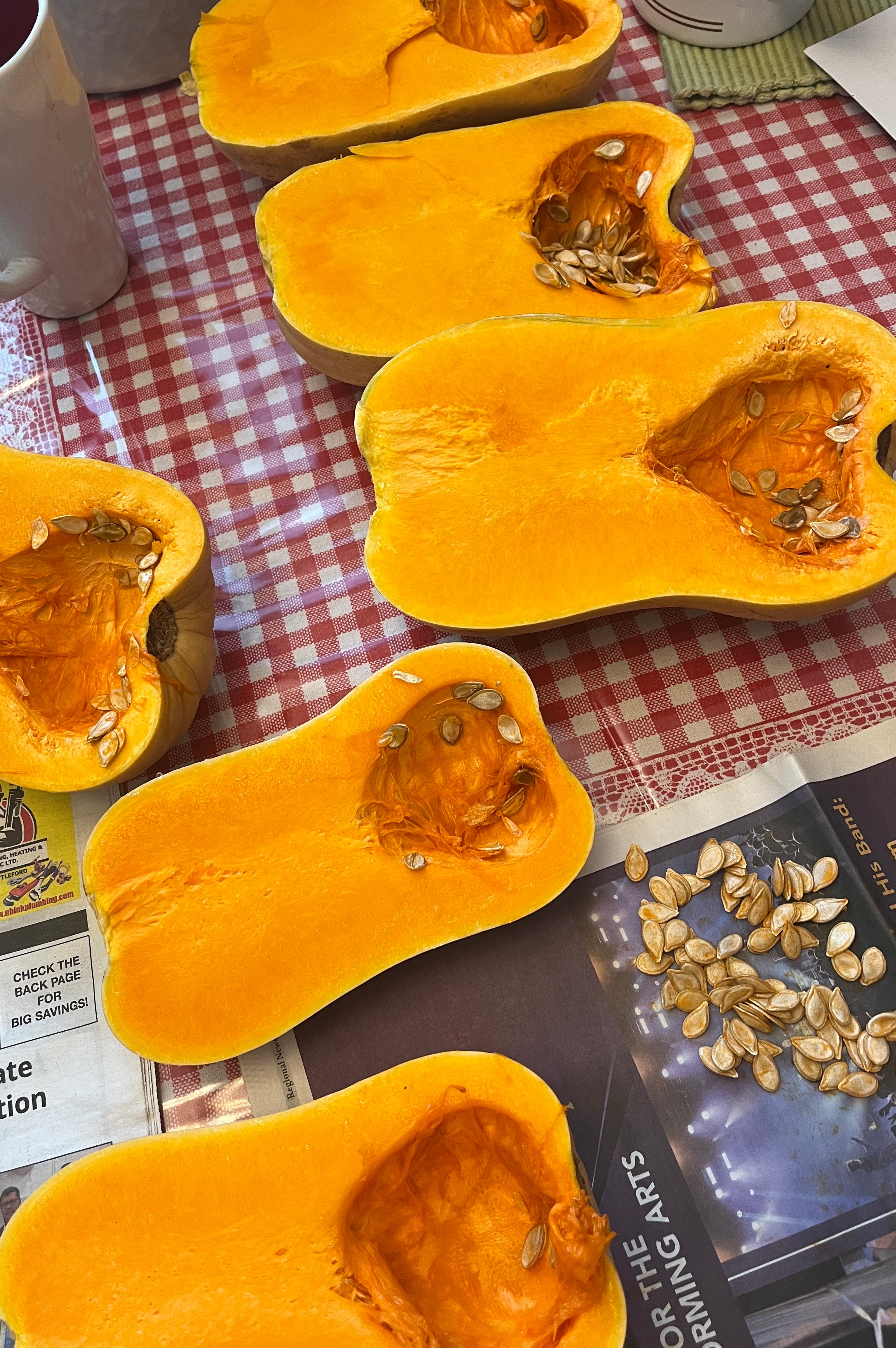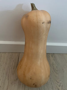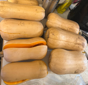 We have never been successful in growing mature butternut squash, until we got a sample of seed from the seed exchange table at an event in Calgary, which produced for us, in 2024, a good yield of fairly mature fruits. Some variability in fruit size, shape, and slight colouration, but generally a tan skinned, long solid necked squash, with an enlarged bulb on the end containing seeds in a small seed cavity. High quality bright orange fleshed squash which keep well throughout the winter. First photo of our last fruit in April 2025.